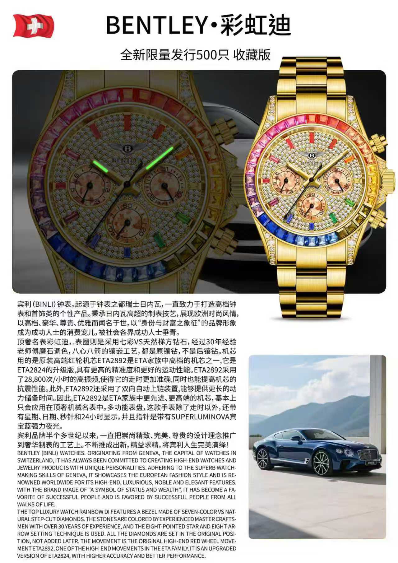 Bentley Watch Bentley Luxurious Gold Chronograph Watch with Dazzling Rainbow Crystal Bezel (Retail at 59800 RMB at JD)( FREE FOR PAYING MEMBERS ONLY)